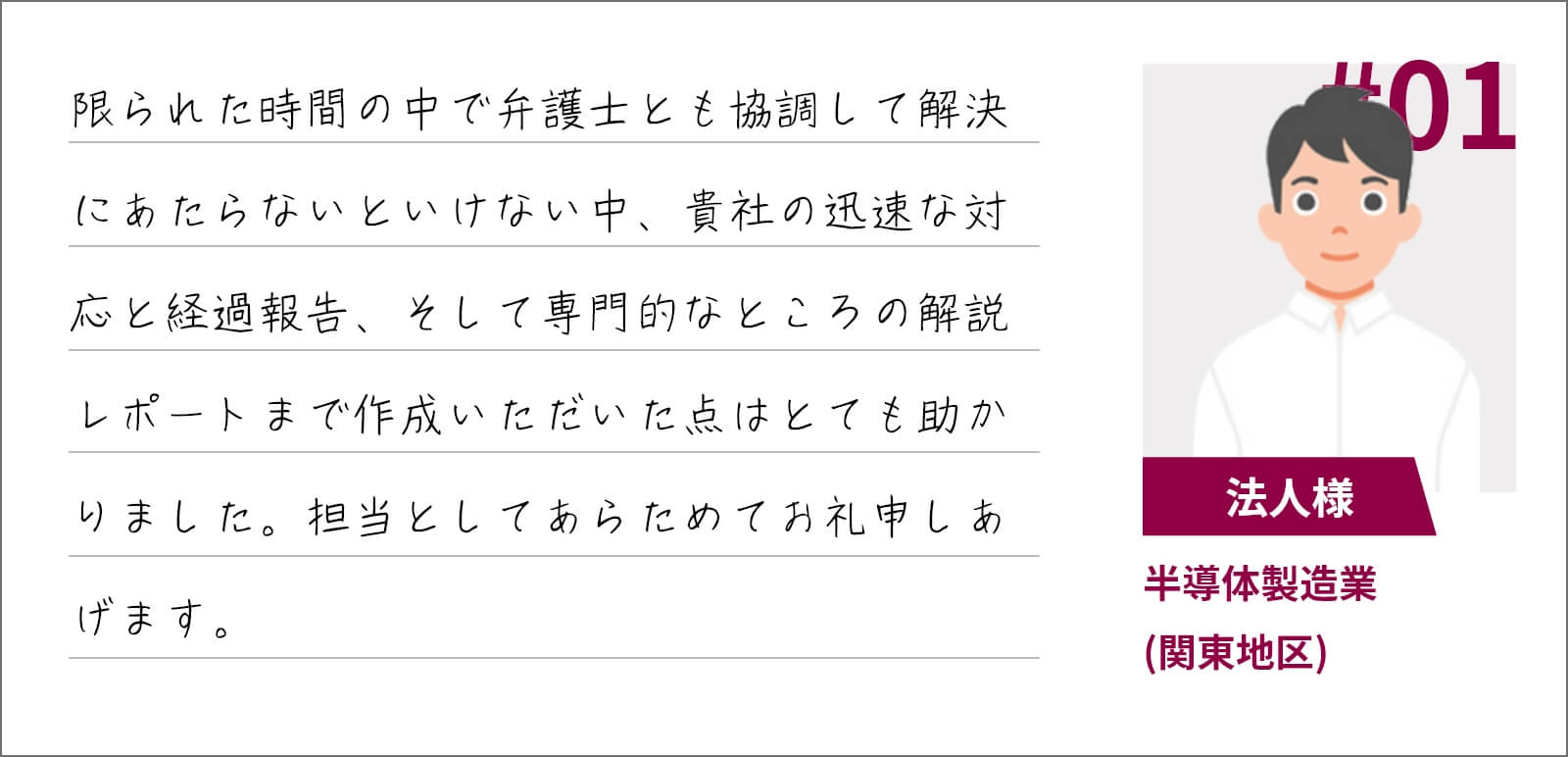 お客さまのトラブルを必ず解決できると断言はできません。過去にくやしい思いをしたこともあります。それでもお客さまが最後にガッツポーズでできるように、精一杯の準備と挑戦を続ける所存です。