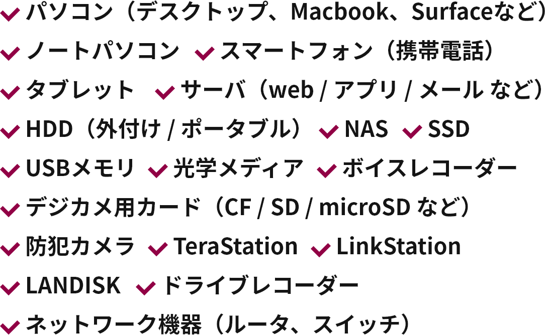 パソコンやサーバなど、どのような機器でもご相談下さい。専用設備もございますので、可能な限り調査いたします。